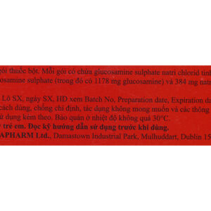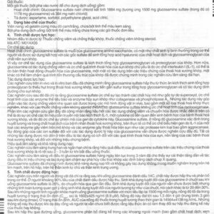 Hoạt chất chính:Glucosamine sulfate kết tinh 1884 mg (tương ứng 1500 mg glucosamine sulfate (trong đó có 1178 mg glucosamine) và 384 mg natri chlorid)